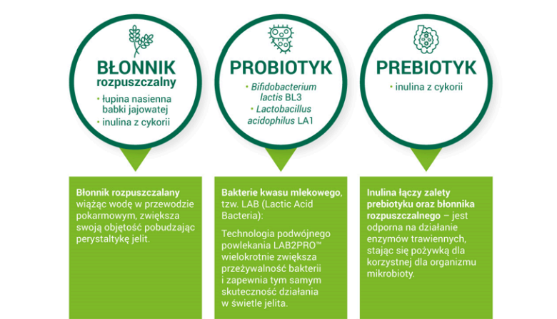 Błonnik zawarty w produkcie wiąże wodę w przewodzie pokarmowym, wielokrotnie zwiększa swoją objętość pobudzając tym perystaltykę jelit, dzięki czemu następuje regularne przesuwanie wypełniającej je masy i regularny rytm wypróżnień.