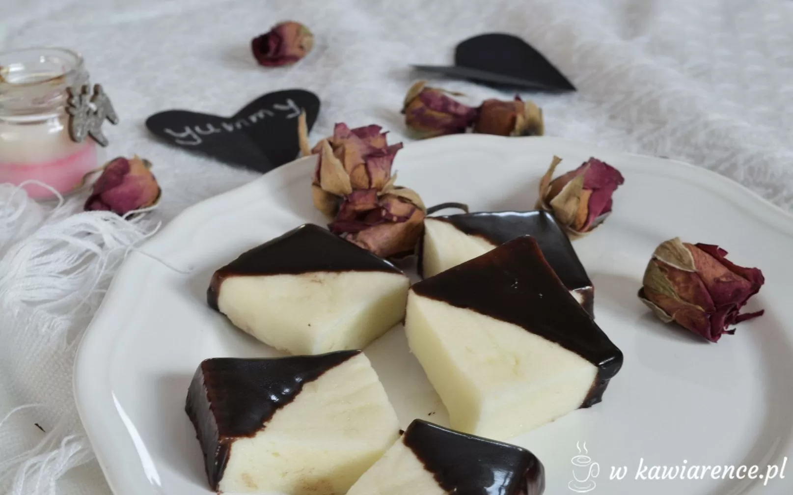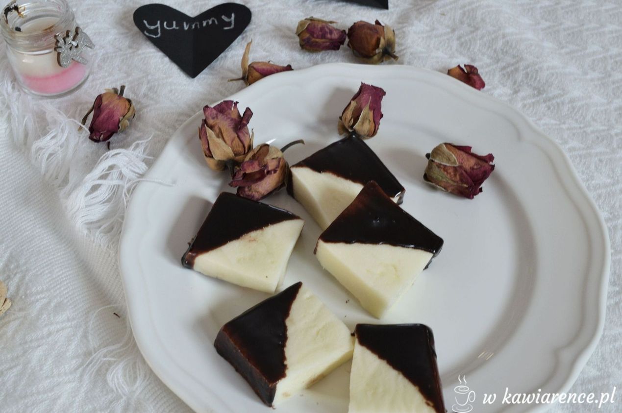 roztapiamy czekoladę lub przygotowujemy sami polewę czekoladową. Zastygłą pianko-galaretkę kroimy na kostki i moczymy w polewie. Wstawiamy na kolejne 20 minut do lodówki.