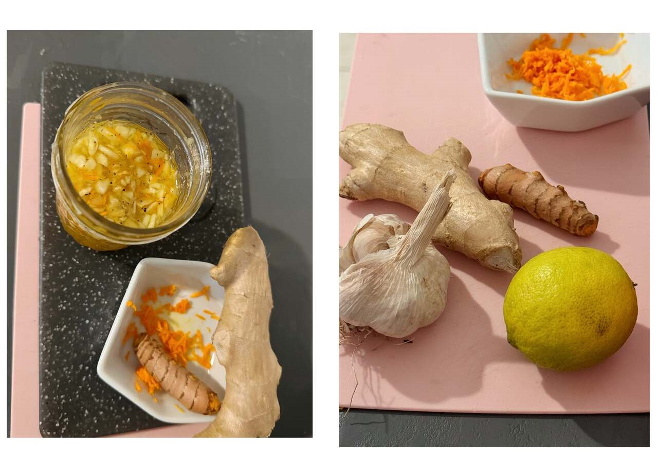 Kurkumę (uwaga! plami palce) oraz imbir zetrzyj na tarce, czosnek drobniutko posiekaj. Wszystko zmieszaj z miodem, wodą i szczyptą pieprzu. Wyciśnij sok z limonek. Całość połacz i odstaw na 24h.