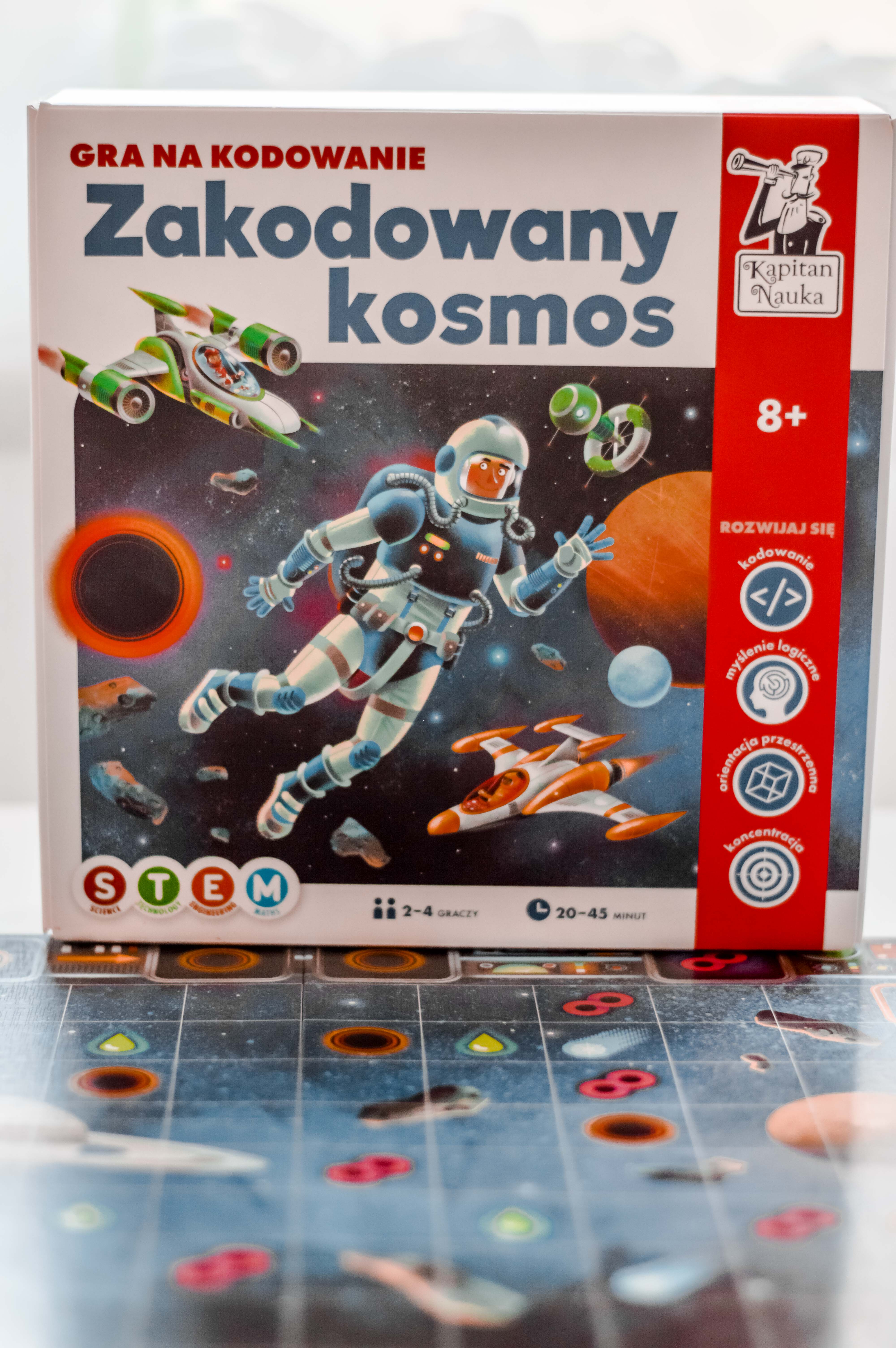 Gra na kodowanie od Kapitana Nauki zawiera gwiaździstą planszę z panelem do kodowania, 4 pionki-rakiety, 4 statki kosmiczne w formie puzzli oraz 7 żetonów kodowania i 65 żetonów podróży.