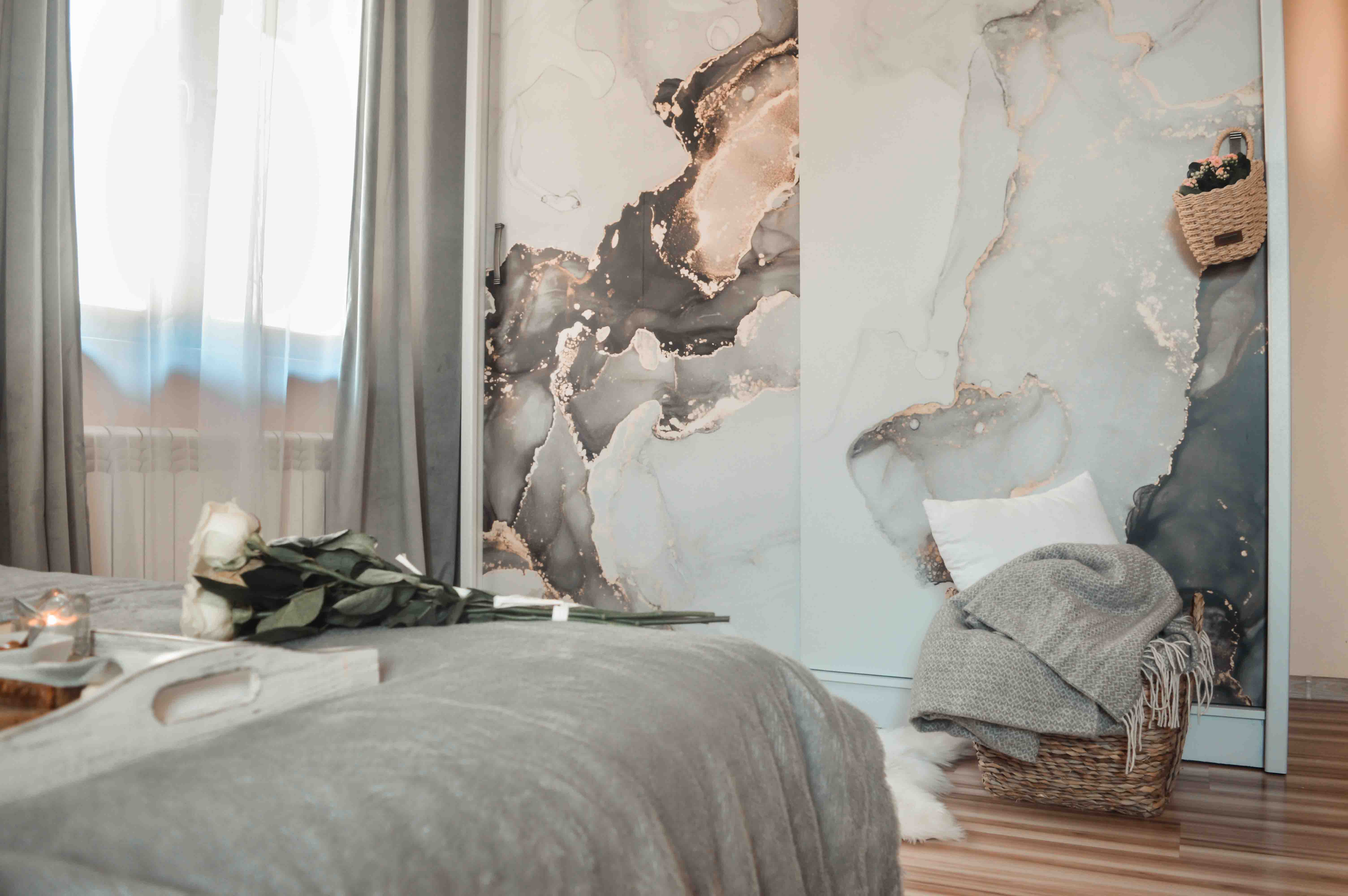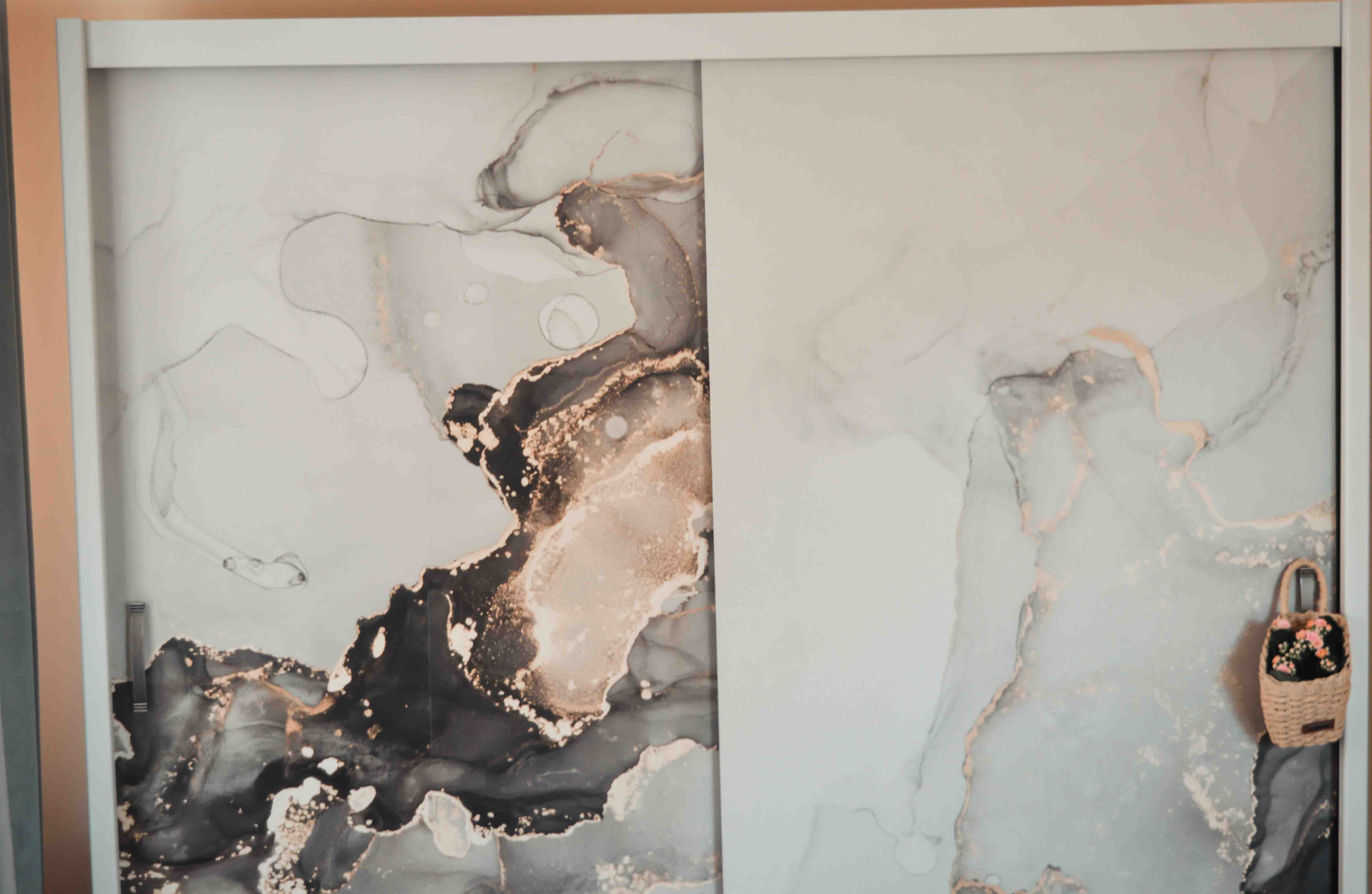 Dlatego zdecydowałam się na fototapetę: kropla atramentu w kolorze czarnym rozpuszczająca się w płynie z elementami w złotym kolorze z Decor Mint. Co więcej, wybraliśmy fototapetę samoprzylepną, której naklejenie na drzwi szafy, trwało dosłownie kilka minut. Gdybyśmy dokonywali metamorfozy szafy latem, uwinęlibyśmy się w 1 dzień, bo farba z pewnością szybciej by wyschła.