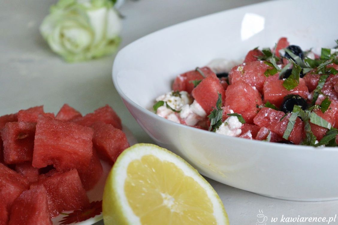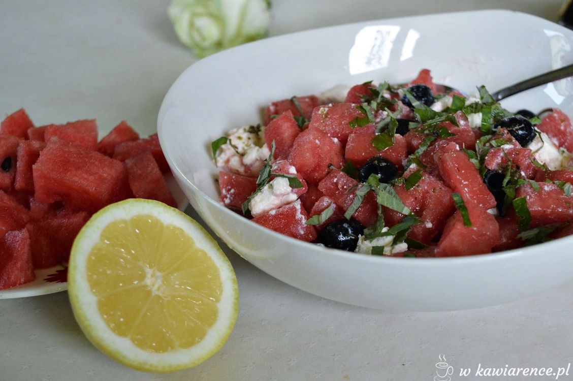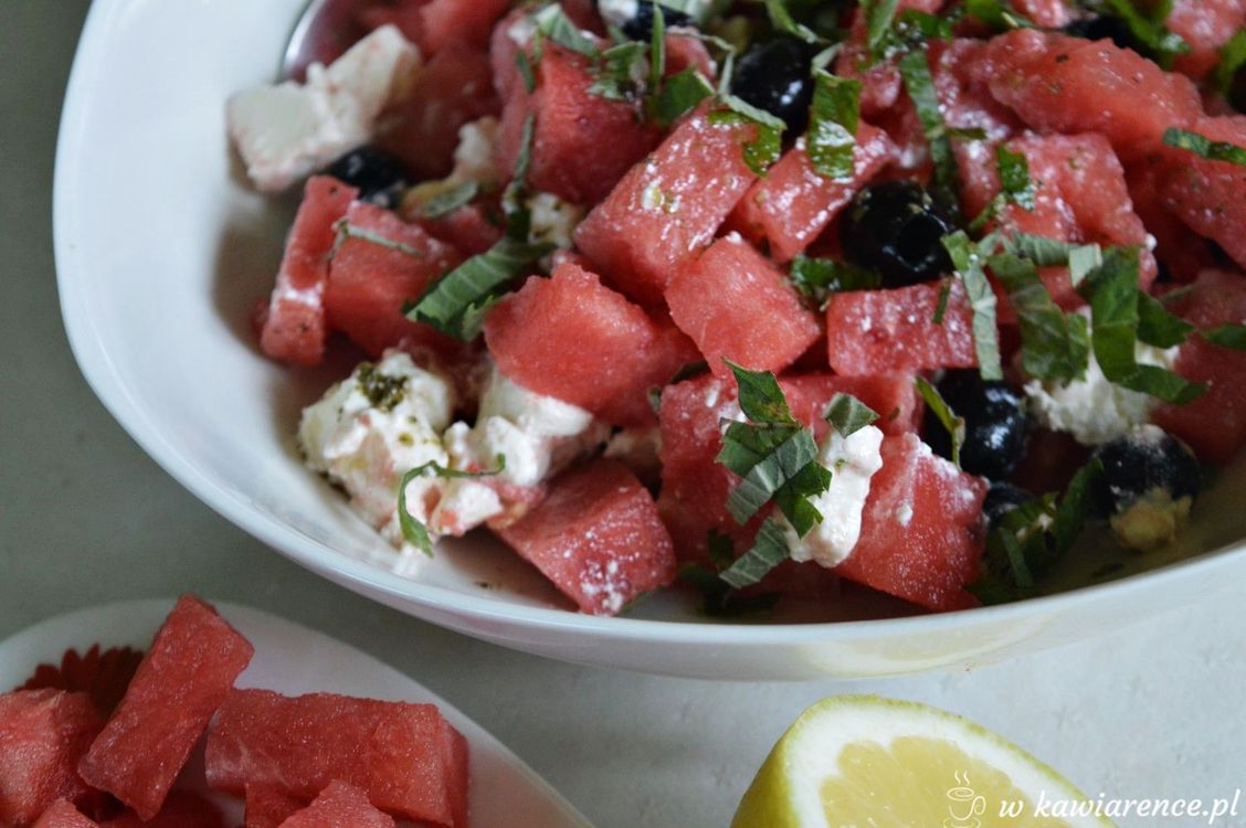 sałatka z arbuza z fetą miętą i oliwkami dressing